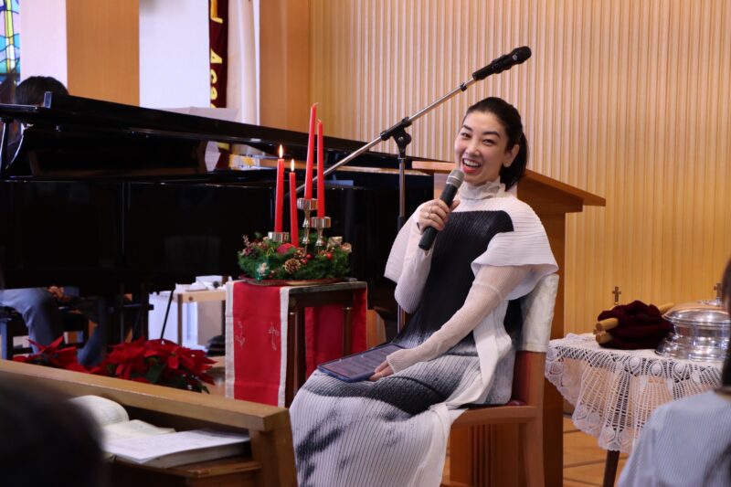 坂井田真実子さん(ソプラノ)と石井里乃さん(ピアノ)をお招きしクリスマスコンサートを開催しました。沢山の地域の方が参加されました。坂井田さんのお証から、神様から与えられた歌、病と共にどのように生きておられるかを伺い、神様の愛を深く感じました。そしてその美しい歌声を通して神様に触れていただく幸いなクリスマスのひとときでした。